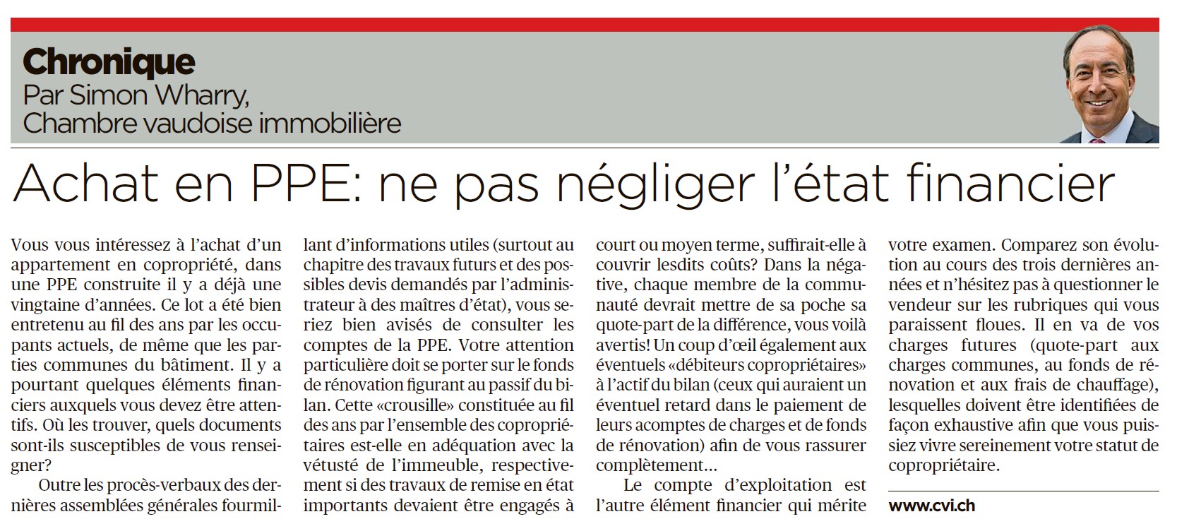 CVI Chambre vaudoise immobilière > Chroniques > Propriété par étages > Achat en PPE : ne pas négliger l’état financier